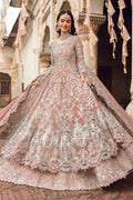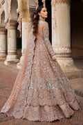 'Diyora' is a poetic symphony of meticulous craftsmanship - Weaving timeless allure with ethereal 3D floral work from expressions of glistening stones, crystals, pearls & cut dana that embody a living poem of grace. Designed in French patterns, this masterpiece is perfect to grace nikah & walima look.