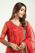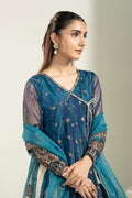 Embroidered tie and dye angrakha with embroidery on front sleeves and ghera. And beautiful tassels at front. Along with heavy embroidered organza dupatta and straight trouser