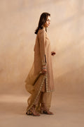 In a warm Camel hue, this elegant 3-piece set is a tribute to understated charm. The V-neck kurta features a delicately embroidered floral yoke, with intricate detailing on the neckline, bodice, and sleeve hems. A fixed front, side zipper, and elasticated back ensure both form and ease. Paired with straight pants and a soft, sheer organza dupatta adorned with a 4-sided embellished border, this ensemble blendss