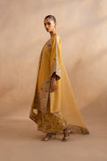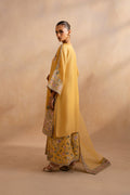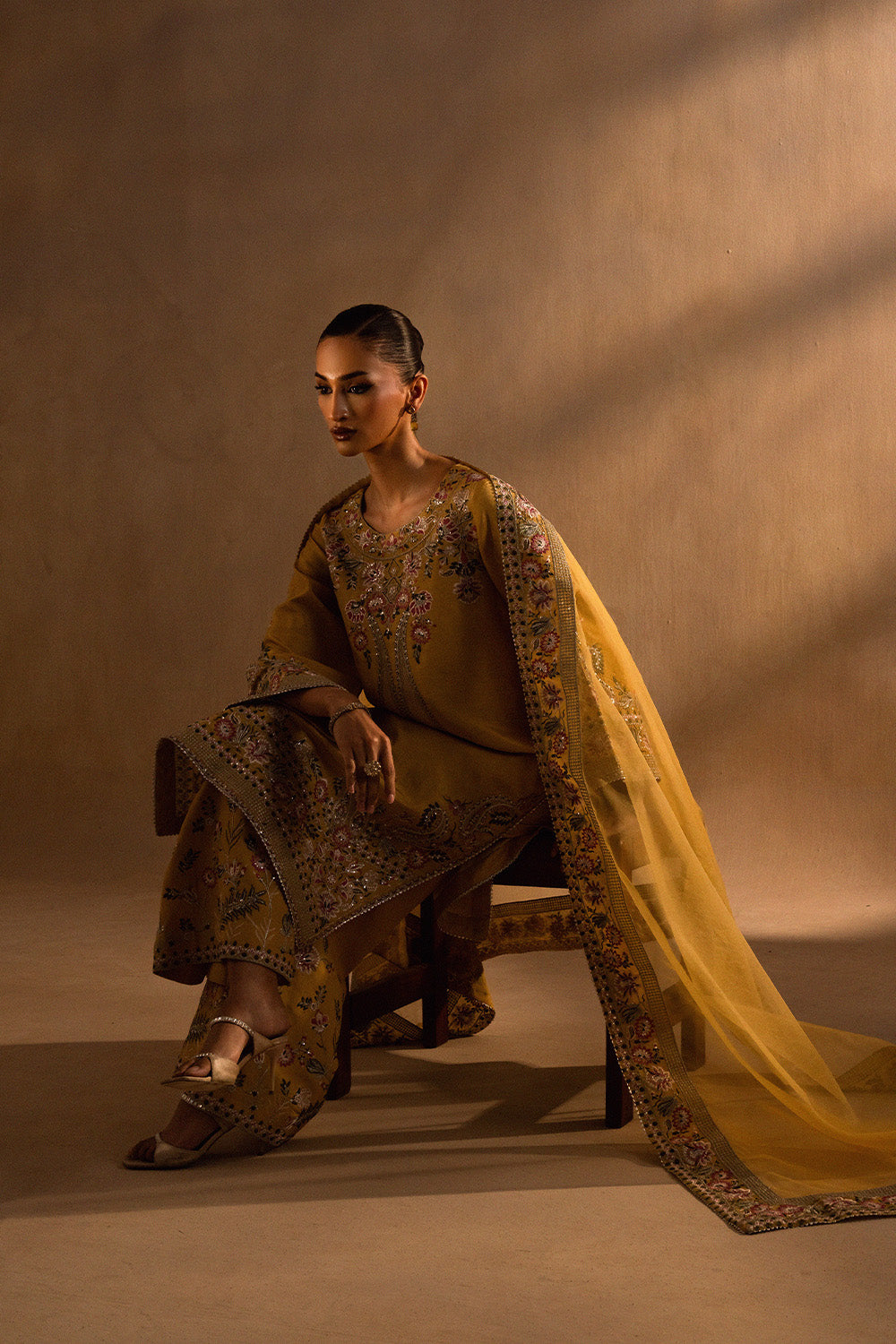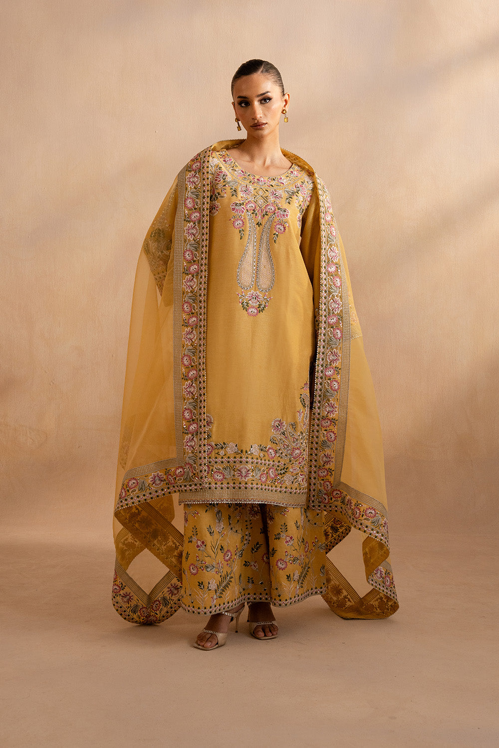 Bathed in Primrose Yellow, this 3-piece ensemble glows with sunshine charm. The roundneck straight shirt, crafted in organza silk, features wide sleeves and is richly embroidered at the neck, sleeves, and hem, accented with delicate lace trims. Paired with same-tone grip trousers, fully embroidered for a seamless look, and finished with a fixed front, side zipper, and elasticated back for ease. The look is completed with a matching organza dupatta, framed gracefully with four-sided embroidery borders-a soft whisper of elegance.