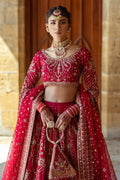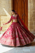 This well composed fuchsia red bridal piece is adorned with round neckline & scalloped three quarter sleeves and is ideal for the brides who wants something different on their big day. The outfit is structured with well composed motif play. The back of the choli is adorned with handmade crystal tassels. The lehenga, choli & dupatta are bedazzled with heavy hand adda embellishments all over including naqshi, dabka, payal, sitari work, cut dana, stone work & crystal hangings details & embroidery along with texture play, pattern work & delicate resham work on the bodice along with heavy thread texture details & self-embroidery.  The lehenga is adorned with composed motification spreading its wings all over the fabric, finished with chunky layers of textured & embellished borders finished with lace. The dupatta is adorned with embellished motif spread along with adda embellished & embroidered borders finished with crystalized ends & screen printed facing to give that stiff royal look. Outfit is paired with an adorable embroidered & embellished geometrical potli bag.