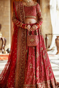 In a crimson red hue, Shahana exudes the aura of modern sophistication with its royal color palette, round neckline & scalloped three quarter sleeves. The lehenga choli is bejeweled with heavy hand adda embellishments all over including naqshi, dabka, payal, heavy sitari work, cut dana, stone work & crystal hangings details & embroidery along with texture play, pattern work & delicate resham work on the bodice. The back of the choli is adorned with heavy handmade tassels. The main showstopper is the glistening lehenga with an all over pattern of heavy adda embellishments including crystals, mukeish, cut dana, sitari & playful texture work with thread embroidery along with intricate motifs finished with heavy layers of embellished and embroidered borders. The dupatta is adorned with hand adda embellishment patterns & embroidery spread a long with heavy embellished border finished with screen printed facing giving it a luxurious effect. Outfit comes with uniquely structured embellished & embroidered clutch.