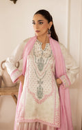 Auri is a dreamy ode to summer elegance. Rendered in soft ivory crepe, this flowing silhouette is brought to life with dainty florals and delicate hand-embellished accents that whisper femininity. The blush pink silk dupatta adds an irresistible touch of luxury, while the ombre printed shalwar completes the look with subtle drama.