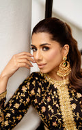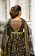 Step into a world of grace with 'Mahi' redefining modern elegance. This black Italian silk masterpiece features a richly adorned neckline and gold foil floral panels, complemented by handcrafted details, sequined borders, and a Russian silk choori daar with an organza dupatta for an elegant yet contemporary look