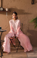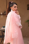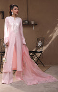 Delight in the allure of IVAN, a powder pink three-piece ensemble crafted for parties. This outfit features a slightly A-line front-open straight shirt with intricate stitching and pearl-accented embroidery. The enhanced neckline and stylishly detailed sleeves add a refined touch. Paired with boot pants and a rich organza dupatta with scalloped embroidery and delicate droppings, IVAN captivates with its exquisite charm and grace.
