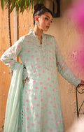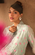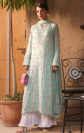 Revel in the charm of UZURI, a Caribbean Aqua Green three- piece ensemble designed to make a statement. The screen- printed shirt, adorned with hand-embellished cutwork details and a V neckline, is perfect for any occasion. Paired with a crushed flared sharara and a luxurious silk hand embellished sequins spray dupatta featuring an Aqua green scalloped border, this outfit is ideal for everyday wear or a day event. Relish the beauty and allure of Uzuri.