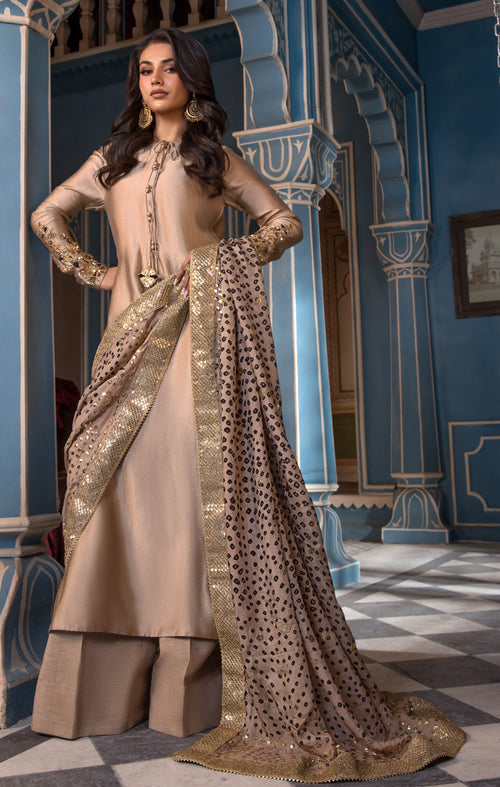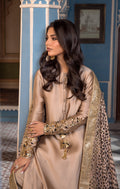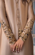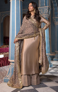 Introducing the €œMAELIS€� ensemble from our Mehr o Mah Collection, exquisitely crafted for Eid ul Fitr. This resplendent silhouette, in a sophisticated palette of bronze and gold, is a true vision of elegance. The tissue silk shirt is adorned with intricate hand embellishments and adda work, showcasing delicate scrolls of floral vines along the sleeves.