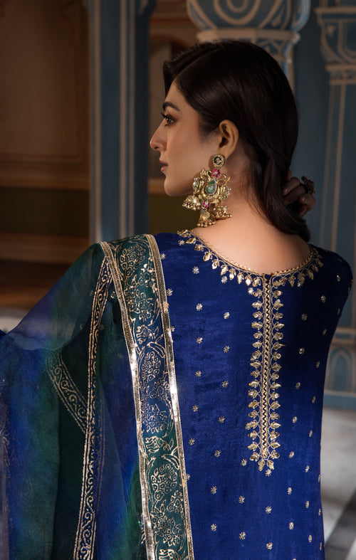 A deep, dark, and romantic ensemble crafted from luxurious silk, featuring an intricately hand-embellished neckline and sleeves. The irresistible combination of blues, gold, and green, with occasional touches of gold, is sure to make you stand out effortlessly. The accompanying izaar pants, in a complementing blue hue, are tailored from silk and finished with a handworked border, adding a touch of refined elegance. The dupatta, cut from blue and green organza, is richly adorned with block print throughout and finished with a delicate lace-trimmed border, completing the outfit with grace and sophistication.