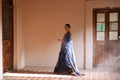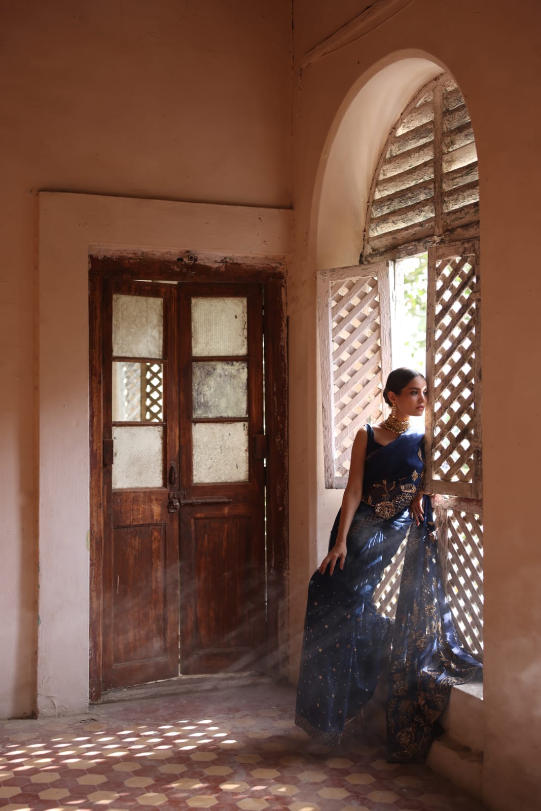 Look right out of a mughal fairytale in this blue saree. Floral gold zardozi, dabki nakshi kaam decorate the saree.