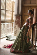 Look super chic in this green and pink lehnga choli! The choli features delicate floral gold and pink embroidery that covers the garment. The lehnga features a a linear floral design that starts are the waist and leads you to a contrasting gold, pink and orange border. The outfit is completed by a pink jamawar dupatta with a gold border and a matching bag.