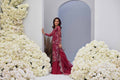 Look striking in red! A embroidered trelis pattern features as a base for the pattern on the shirt with gold floral and embroidered details. The sleeves feature cutout details and delicate floral motifs by the wrist. The outfit is completed with wide leg pant a matching floral embroidered dupatta.