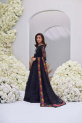 Be the most chic person in the room in this black kalidaar with black embroidery! The outfit feaftures floral embroideries on the neckline, sleeves and bodice of the outfit. The outfit is completed with a pair of pants a dupatta with a multicolor floral border that adds color to the outfit.