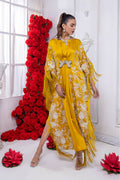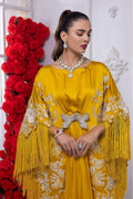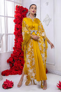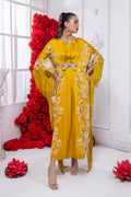 Mustard Silk Kaftaan With embellishment of 3D Brotch with embroidery Of Tilla and Resham Work.