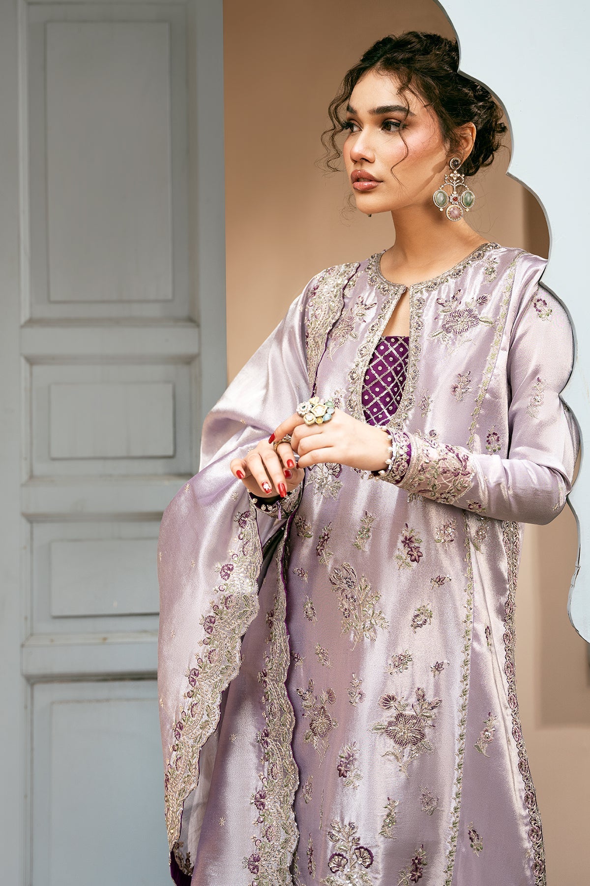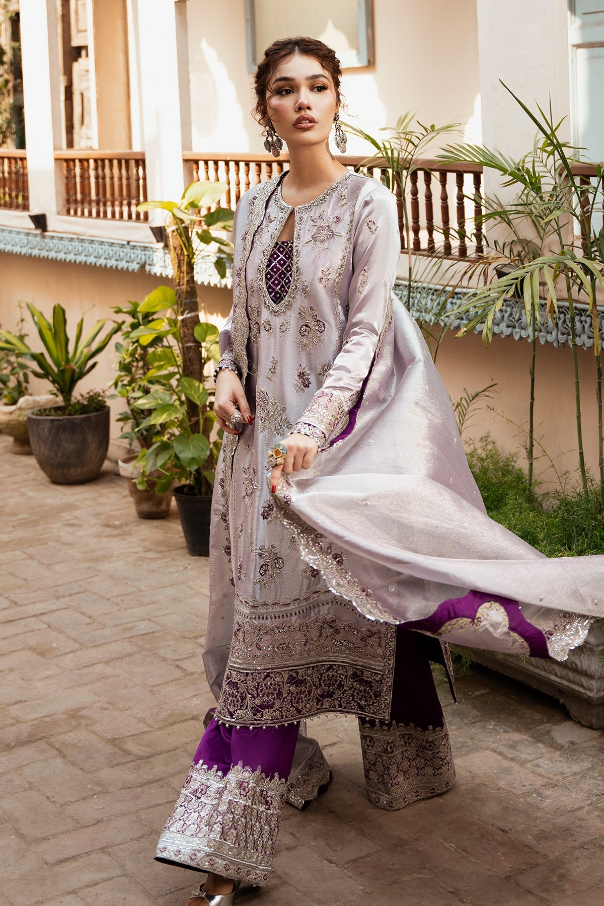 An intricate masterpiece of tilla and resham embroidery, woven with the elegance of pure zardozi craftsmanship. Each element shines Swarovski crystals, kora, dabka, nakshi, pearls, and shimmering sequences enriched by Japanese cut dana. A celebration of timeless grace and luxury, captured in every stitch.