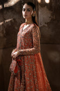 Embroidered with Tilla and Resham, enhanced by sequin work and hand embellishments on the neckline and front slits. The design is further elevated with beautiful Angrakha tassels and delicate dupatta hangings, adding a touch of traditional elegance.