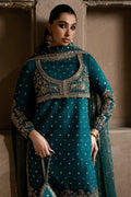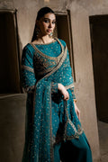 Embroidered with Tilla and Resham, enhanced by sequin work, and adorned with heavy hand embellishments, this ensemble features a waistcoat, shirt front border, and exquisite hangings on the dupatta pallu and front shirt border, creating a captivating and luxurious look
