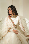 Magnificently crafted ivory angrakha beautifully finished with red silk screen printed embellished border that has been enhanced with gotta finishing. To complement this eye turner look it comes with an organza dupatta that has exquisite border enhanced with opulent adda work on angrakha and dupatta borders.