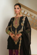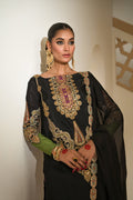 A magnificent black taseel silk shirt with screen printed neckline embellished with cutdana , gold nakshi , dabqa & Sequins. It comes with plain organza dupatta with resham embroidered borders on all four sides , paired with silk shalwar along with screen printed bunches