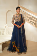 A navy peony silhouette , lavishly adorned with intricate embellishment on the front and back bodice , creates an alluring look. The opulent peshwas showcase heavy embellished borders , evoking a regal charm fit for royalty. Completing this enchanting ensemble with digital printed florals on pishwas. It has four sided embellished borders dupatta exudes an aura of ethereal elegance.