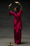 Hoor Bano takes the drama of a vintage silhouette and rewires it for today, cut in punchy Yaqoot Pink silk that moves easily and makes an entrance. The flowing kameez skims the body just right; light enough to move with you, detailed enough to make you stand out. Diagonal pintex lines and slim trim borders frame the shirt and reappear at the ends of the sleeves, while soft tassels finish the neckline with a subtle swing. Itss paired with farshi shalwar that pools dramatically at the hem, and a sheer dupatta scattered with sequins and edged with ornate Mughal-inspired detailing. This oness for when you want to channel vintage fantasy, without ever feeling like yousre playing dress-up.