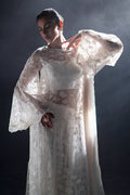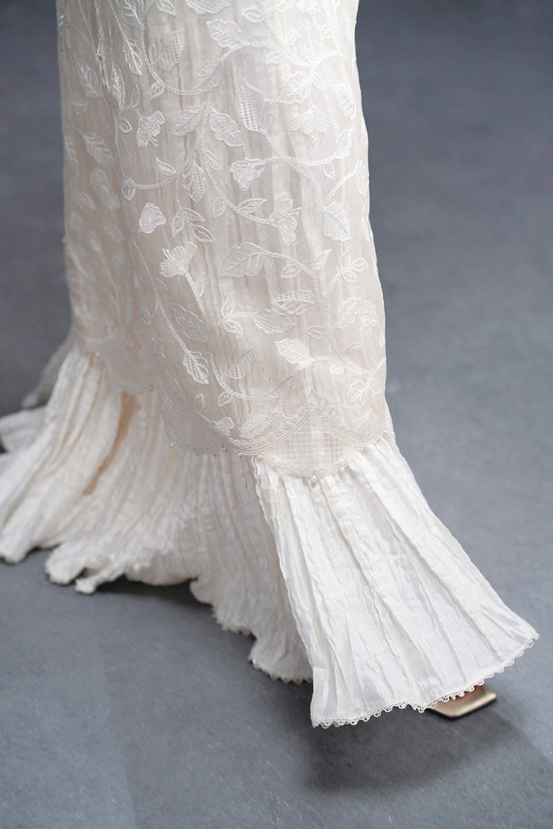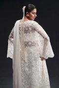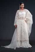 A luminous white kameez crafted from diaphanous fabric, adorned with intricate floral vine embroidery that meanders gracefully across its surface. The neckline and cuffs are meticulously ornamented with delicate pearls, lending an air of understated opulence. The crushed sharara-style trousers shimmer with ornate trims, evoking an ethereal delicacy. Completing the ensemble is a dupatta as light as woven air, dotted with subtle motifs and edged with intricate trims and tassels that dance gently with every movement.