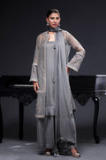 In a palette of soft grey, this ensemble is anchored by an organza jacket embroidered with vertical lines that frame bouquets of delicate florals, each bloom brought to life with fine threadwork. The hem and sleeves are bordered with decorative patterns that echo the jacketss meticulous embroidery. Beneath, a pleated inner slip provides structural contrast, while wide-leg trousers mirror the pleated detail for a harmonious silhouette. A silk dupatta, fluid and luminous, drapes effortlessly