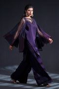 In a rich plum hue, this ensemble layers a dramatic organza jacket, its dramatic wide flared sleeves embroidered with sprawling floral motifs, over a silk inner shirt. The shirtss neckline is detailed with intricate cutouts and delicate beadwork, an exquisite counterpoint to the jacketss bold ornamentation. Boot-cut trousers, dramatically cut, are adorned with lace peeking out from their cuffs, echoing the lace accents on the shirt hem, creating a seamless harmony of texture, color, and detail.