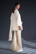 Rendered in a pristine white, this kameez features a boat neckline embroidered with blossoms resembling sprays of babyss breath, while fine lace borders trace the hem and slits. Long, flared trousers are brought to life with lush paisley embroidery that extends to their generous cuffs. The silk dupatta, enveloping you like snow, is bordered with delicate trims that catch the light, completing a composition as radiant as a sunny winter's day.