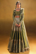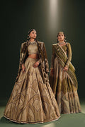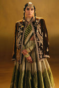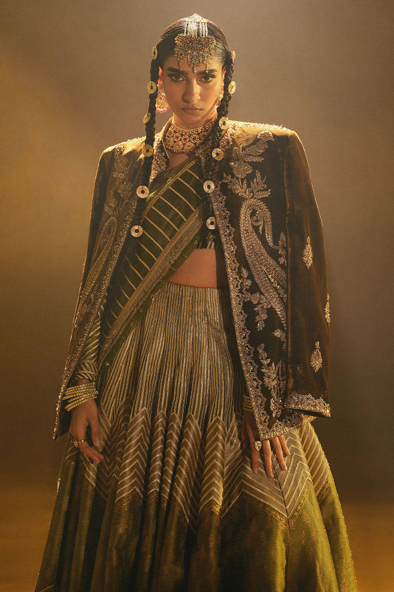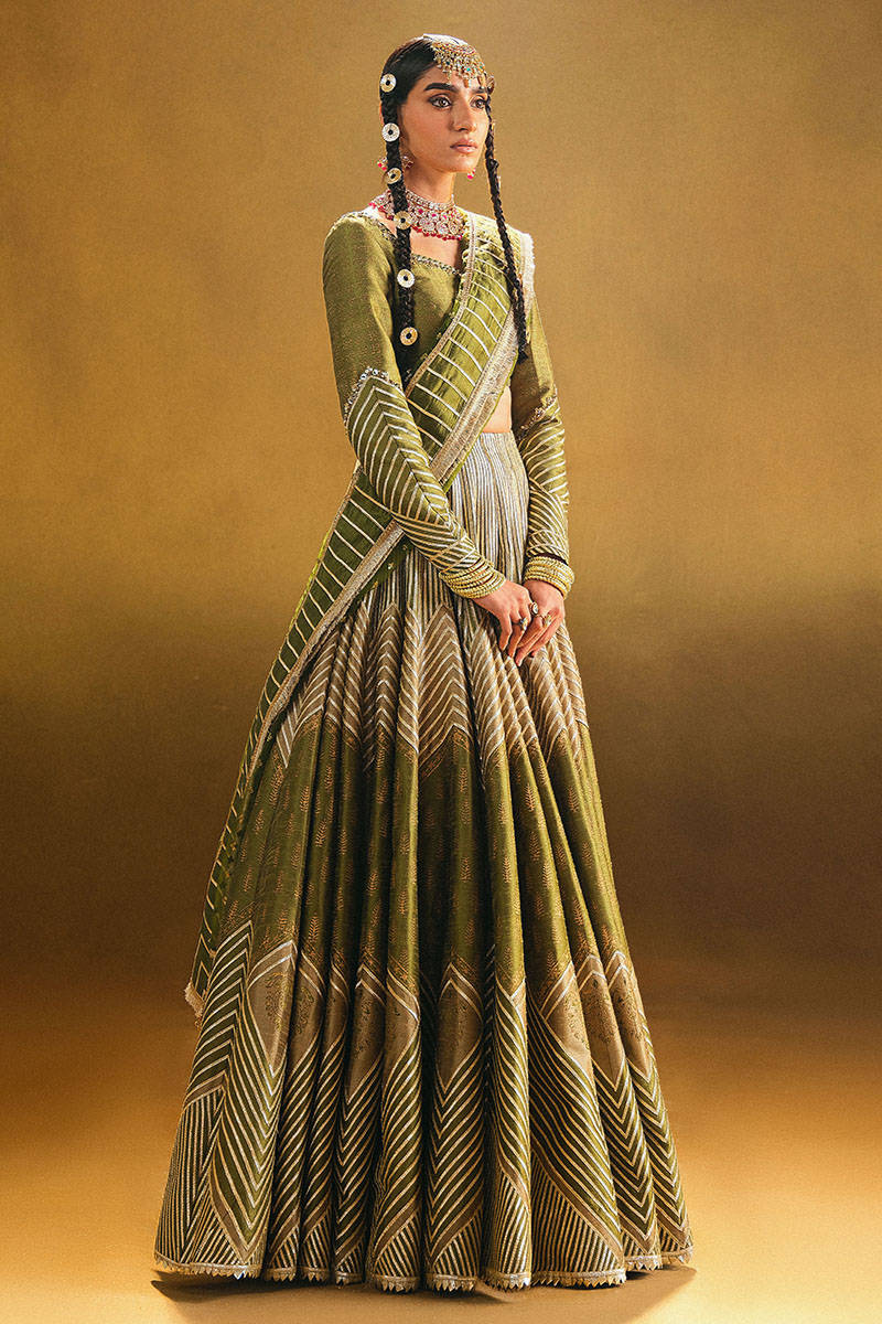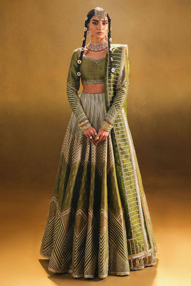Embrace the natural allure of the Amaltas ensemble, featuring a zaitoon green Indian silk lehenga adorned with khaki appliques. The Indian silk choli boasts block and adda work, complementing the Sitari organza dupatta with Indian silk goti and intricate trims. Traditionally used to adorn royal attire, Gota patti is here reimagined to grace this ensemble with cultural richness.