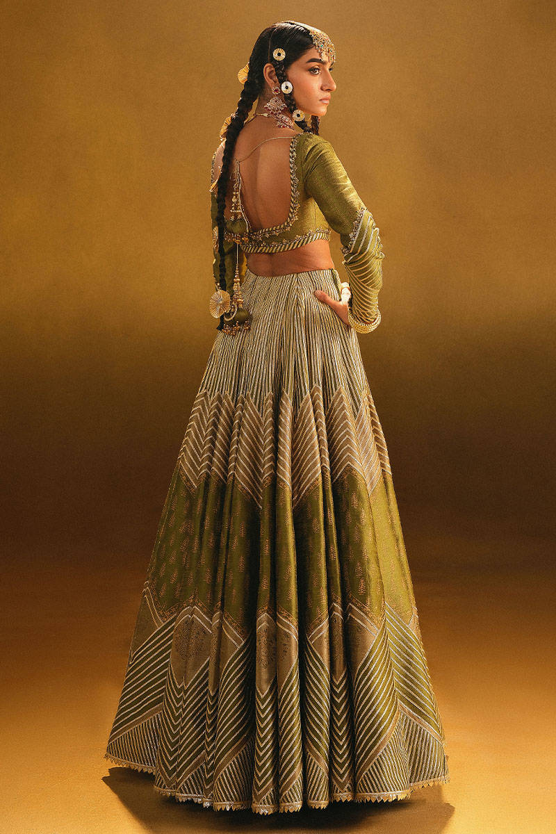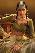 Lehnga: Olive green lehnga in Indian silk with khaki appliques.