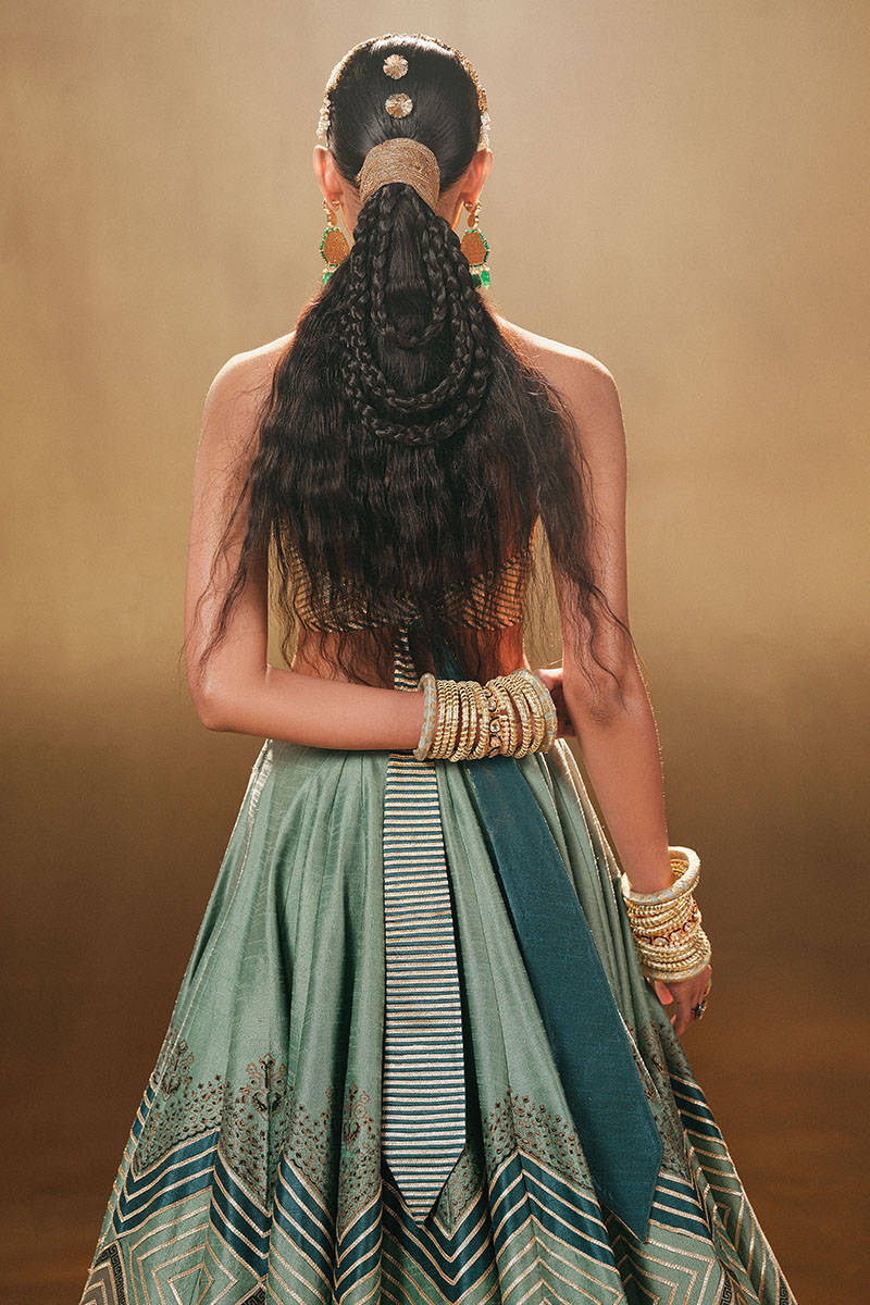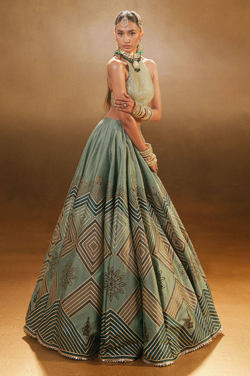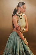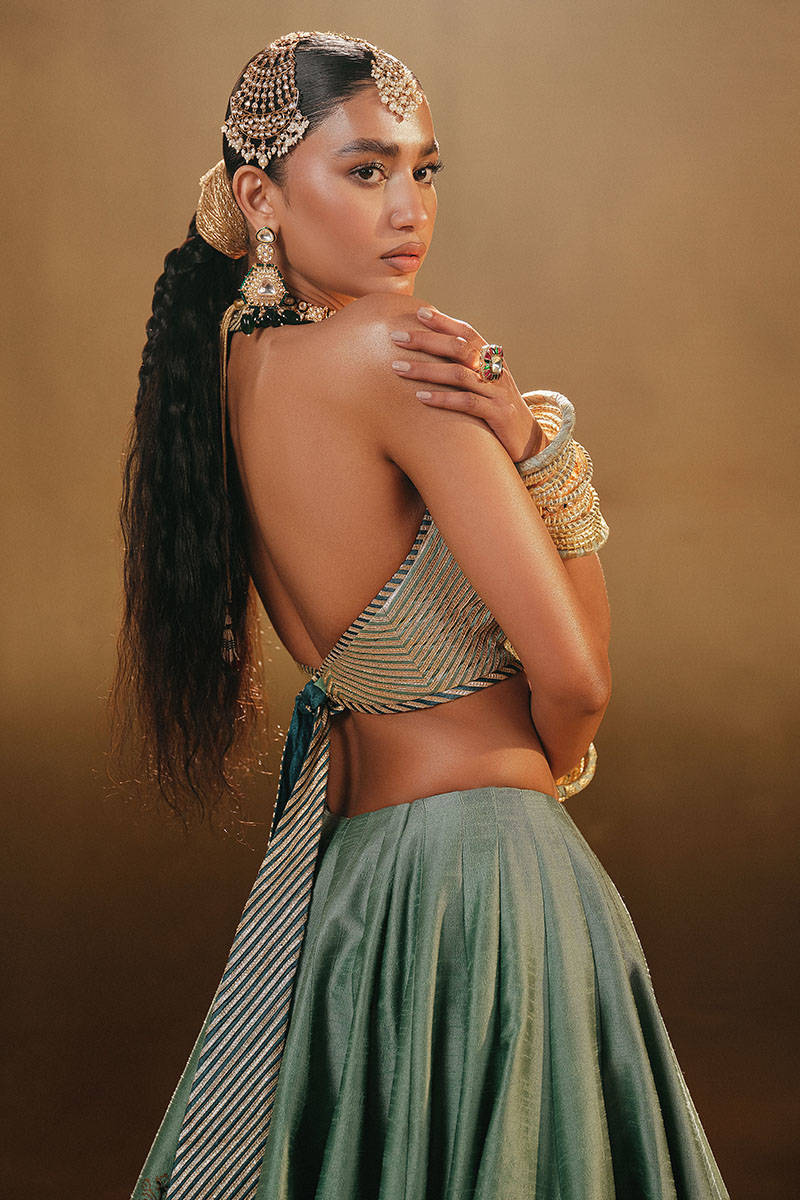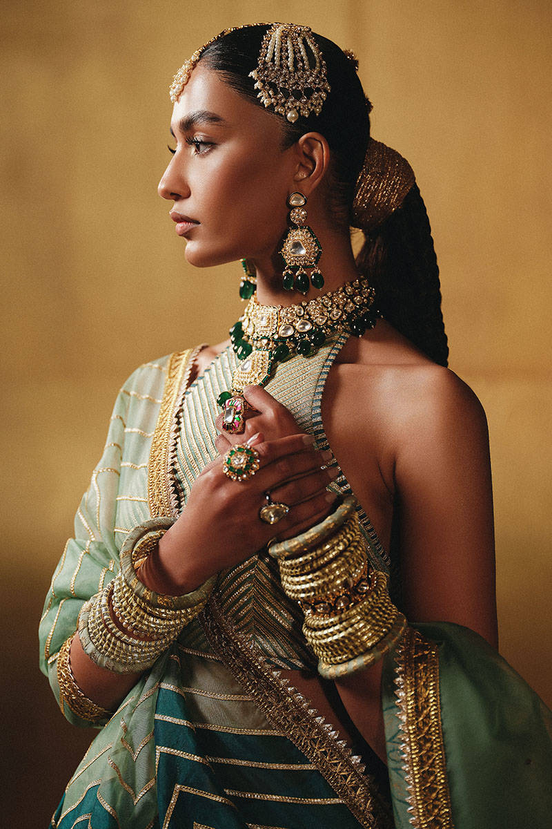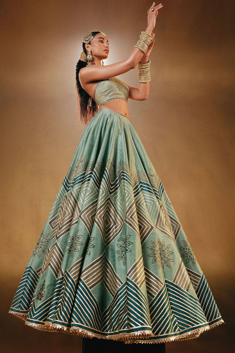 Step into the regal world of the Rangeeli ensemble - a sartorial symphony of heritage and style. The ferozi blue lehnga boasts teal blue and grey appliques adorned with goti and block, creating a masterpiece of craftsmanship. The halterneck choli features exquisite goti work, while the organza dupatta, embellished with block print and goti, adds a touch of royal elegance. This is our contemprary take on gota patti work, a centuries-old art form that breathes life into each stitch