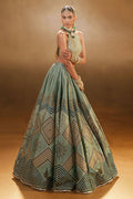 Lehnga: Turquoise Blue lehnga with Teal blue and grey appliques enhanced with goti and block .