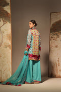 Introducing "Liana," a fusion of modern elegance and traditional charm. Crafted from pure shamoz, this shirt boasts exquisite digital prints that capture attention with their intricate designs. Handmade zardozi borders of kora dapka, naqshi, and diamonties adorn the velvet borders, adding a touch of regal sophistication. Paired with froza dhaka pants and an organza dupatta featuring delicate sequence chan, "Liana" epitomizes grace and style.