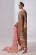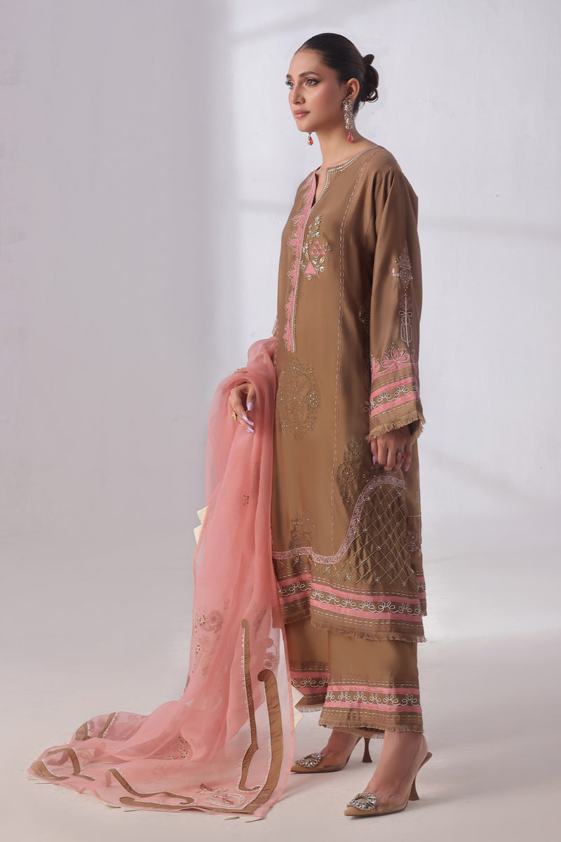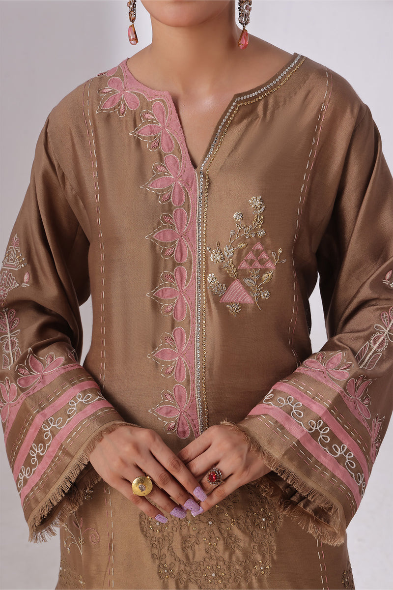 This elegant outfit is crafted from luxurious Shesha silk in a warm coffee shade, perfectly blending sophistication and comfort. Delicate baby pink applique and self-handmade running stitch embroidery add refined, intricate details throughout. The izar features matching pink applique and running stitch work, offering a subtle contrast, while the pure organza baby pink dupatta, adorned with applique patterns on the pallu and thread embroidery motifs all over, completes the look with a stunning, ethereal finish.