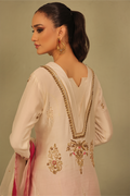 Crafted from pure sheesha silk, this elegant shirt is adorned with intricate gilded and antique zardozi work on both the front and back, beautifully enhanced by vibrant fuchsia resham embroidery. The ensemble includes pure sheesha silk palazzos, featuring hand-embellished borders for a refined touch. Completing the look is a pure organza dupatta, delicately detailed with a sequined border on all four sides and a subtle sequin spray throughout.