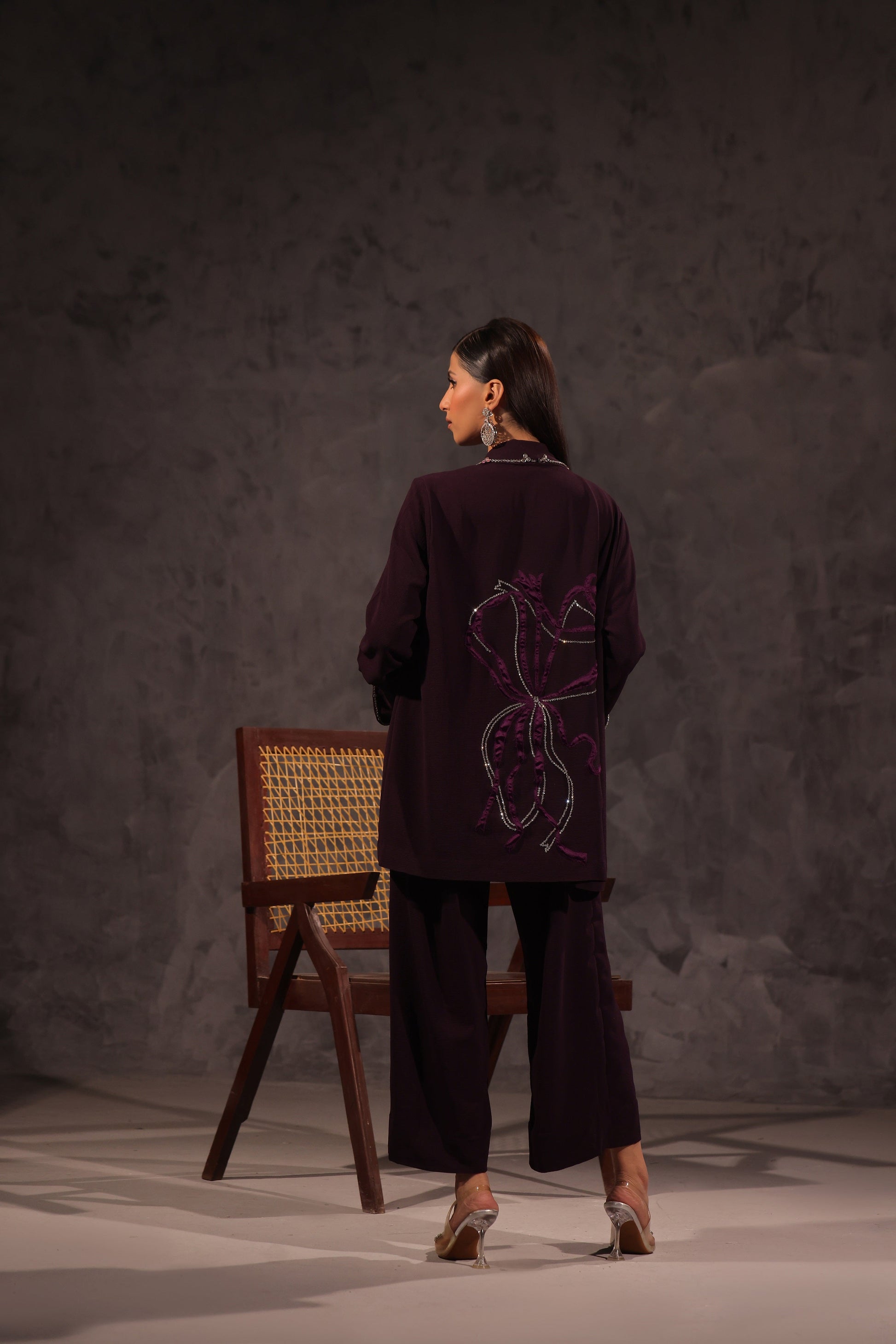 Elevate your wardrobe with Amaya three piece deep purple georgette jacket. Featuring a napail style neckline and delicate hand embellishments of swarovskies, it effortlessly adds a touch of glam. The back is appliqued with self silk and embellished with even more swarovskies. Perfect for any formal occasion.