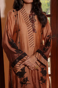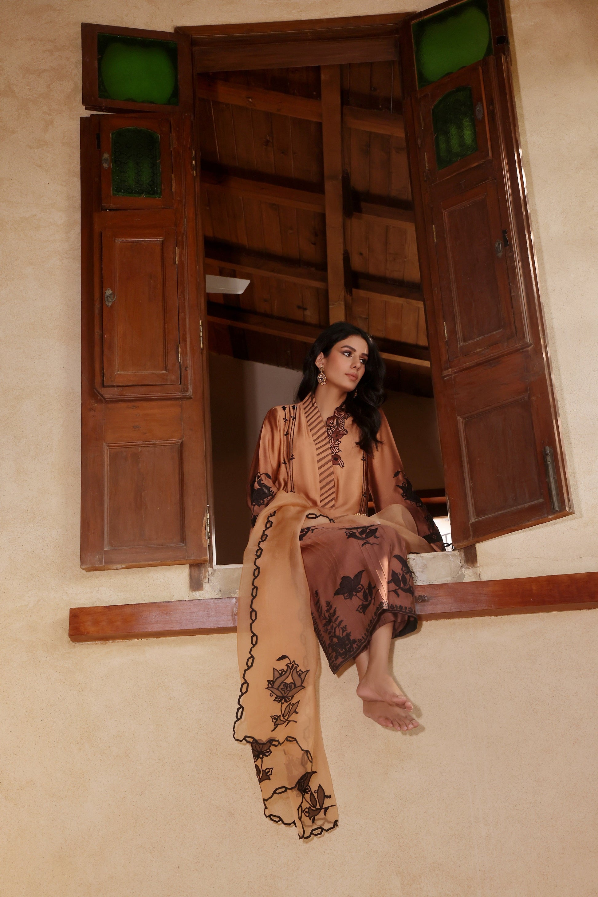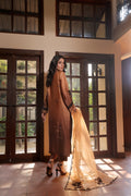 Ariana is an elegant 3 piece comes with an exquisite ensemble, combining shades of light dark brown with intricate black applique and resham embroidery. Adorned with delicate details of black sequins and swarovski crystals, it exudes elegance and sophistication. The pure organza dupatta features scalloped edges and resham motifs on each corner. Includes straight pants for a complete look.