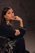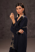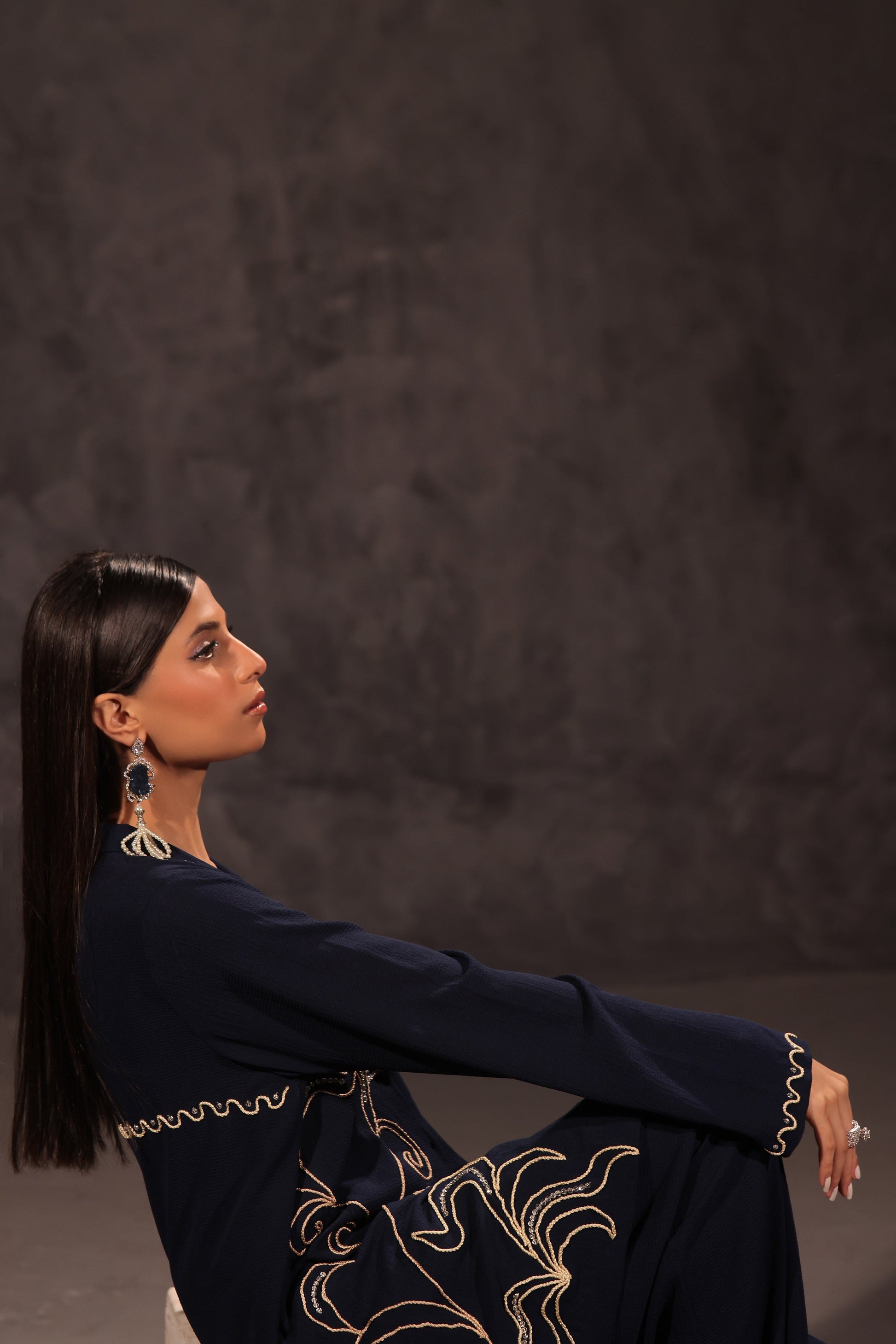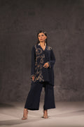 Expertly crafted, Celeste is a stunning three-piece black georgette jacket. The napail style neckline is adorned with hand-embellished swarovskies for a touch of elegance. The back features delicate self-silk applique and more sparkling swarovskies. Elevate any look with this beautiful piece.