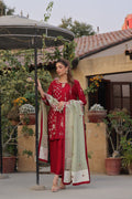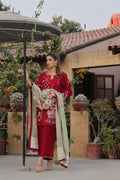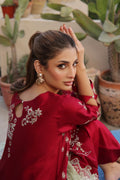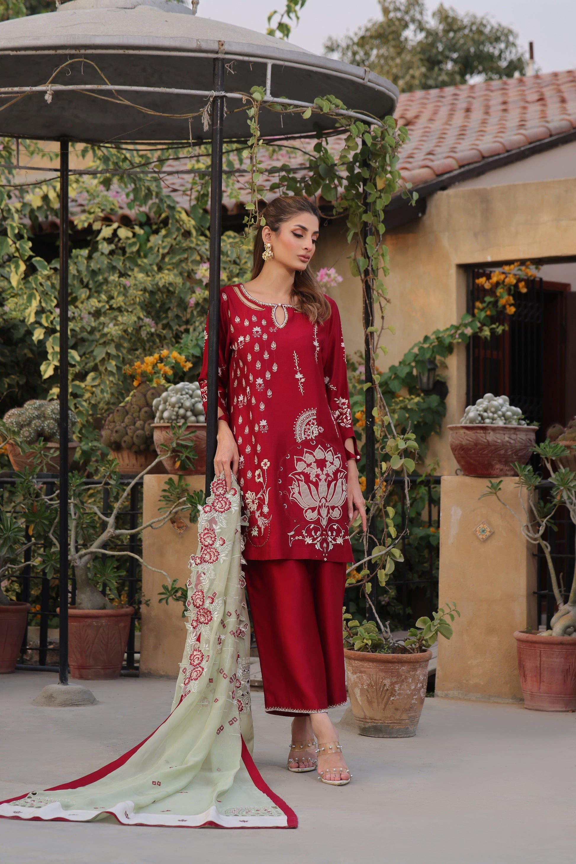 This deep red shirt is intricately embellished with a range of embroidery patterns, making it a unique and eye-catching piece. The neckline features intricate hand-made edging, adding a touch of elegance to the overall design. The accompanying pants also have hand-made edging, adding to the overall aesthetic. The pure organza dupatta in mint green comes with two heavy borders and is adorned with ivory matching embroidery on the palu, making for a complete and stylish outfit.