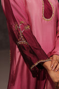 Experience the epitome of elegance with Maahru! This stunning long shirt features ombre dying in shades of pink, adorned with hand-embellished kora dapka on the neckline and sleeves. The intricately crafted back is complemented by beautiful boties, while the pure organza dupatta adds a touch of gold kingri finish. Perfect for any occasion, pair with straight pants or polazao for a chic look.