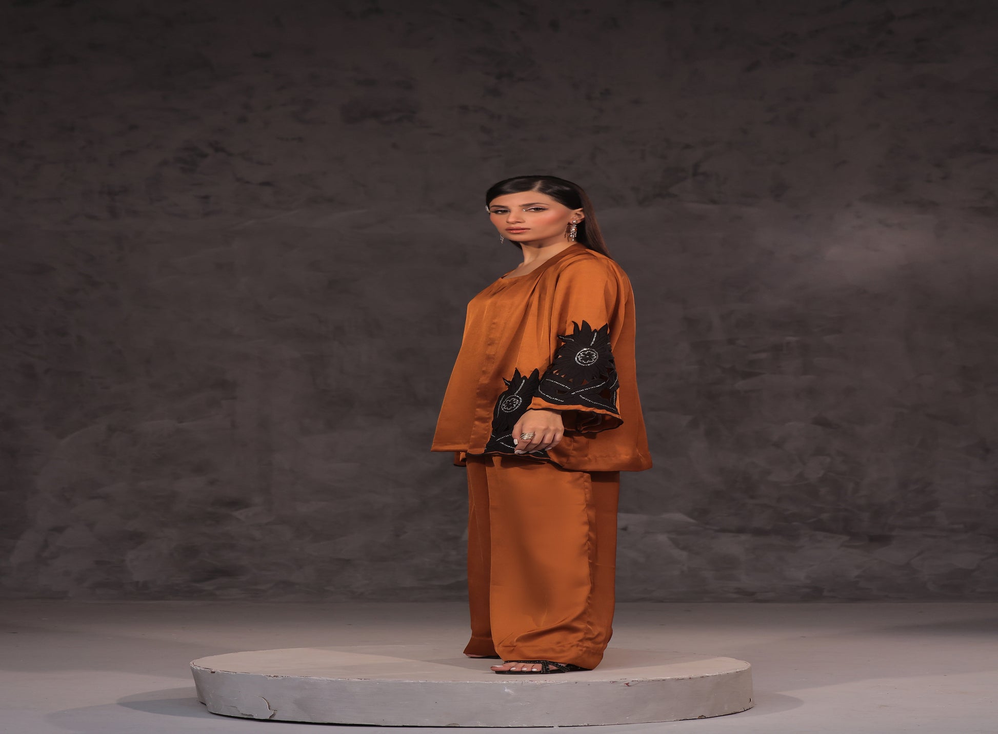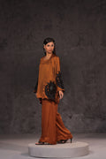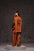 The Meena jacket is a three piece ensemble, beautifully crafted with rust silk and adorned with black applique and hand-embellished Swarovski crystals. The inner lining and straight pants add comfort and versatility. Elevate your wardrobe with this elegant and stylish piece.
