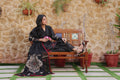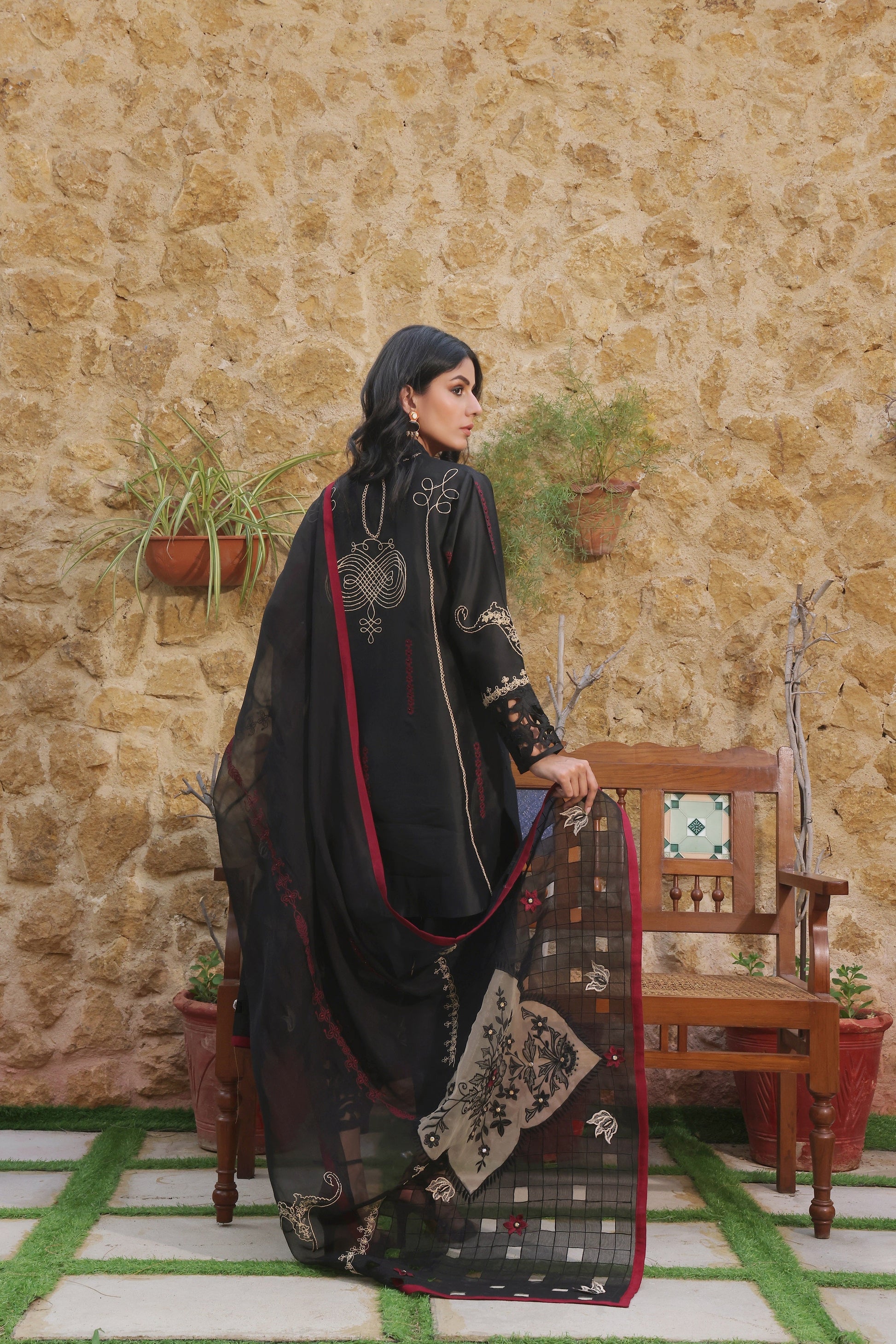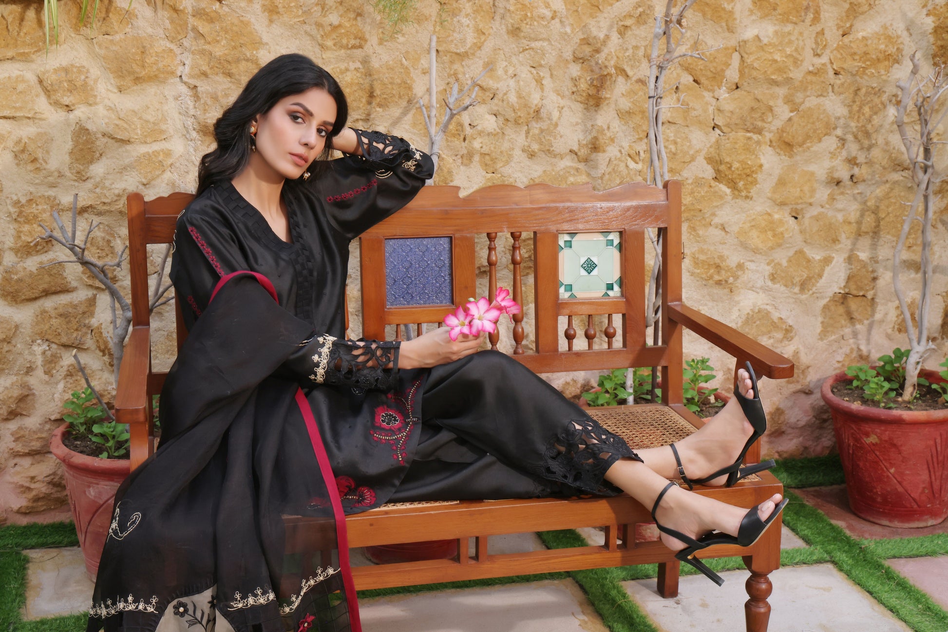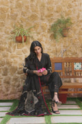 Nazli is a black silk shirt with deep maroon resham embroidery and beige anchor motifs, accented with beautiful cutwork on the sleeves. The matching shalwar also features cutwork. The pure organza black dupatta is adorned with intricate cutwork on the palu and 3D floral and tulip motifs, elevating its elegance.