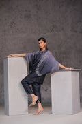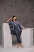 Discover a stunning fusion of steel and charcoal gray on pure sheesha silk with Raniya. This baggy style ensemble features hand-embellished swarovski bails on both panels and front line buttons adorned with pearls and stones. Plus, it comes with your choice of bell bottoms, pants, or palazzo pants for a customizable and fashion-forward look. Elevate your wardrobe with Raniya.