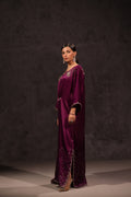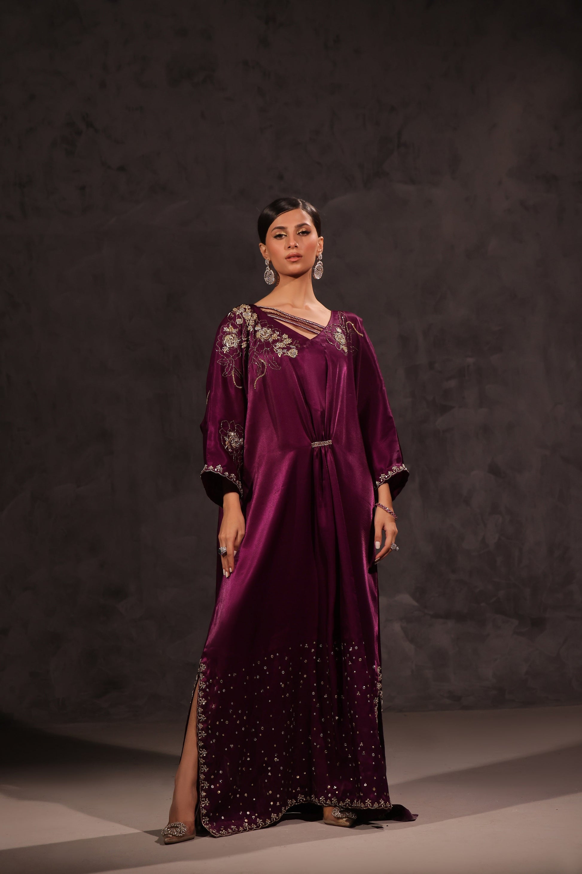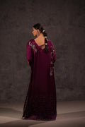 Discover elegance and craftsmanship with Shanaya, the pleated deep purple silk kaftan. Hand-worked details adorn the front, back, and sleeves, creating a unique piece. Elevate your wardrobe with this luxurious and stylish kaftan.