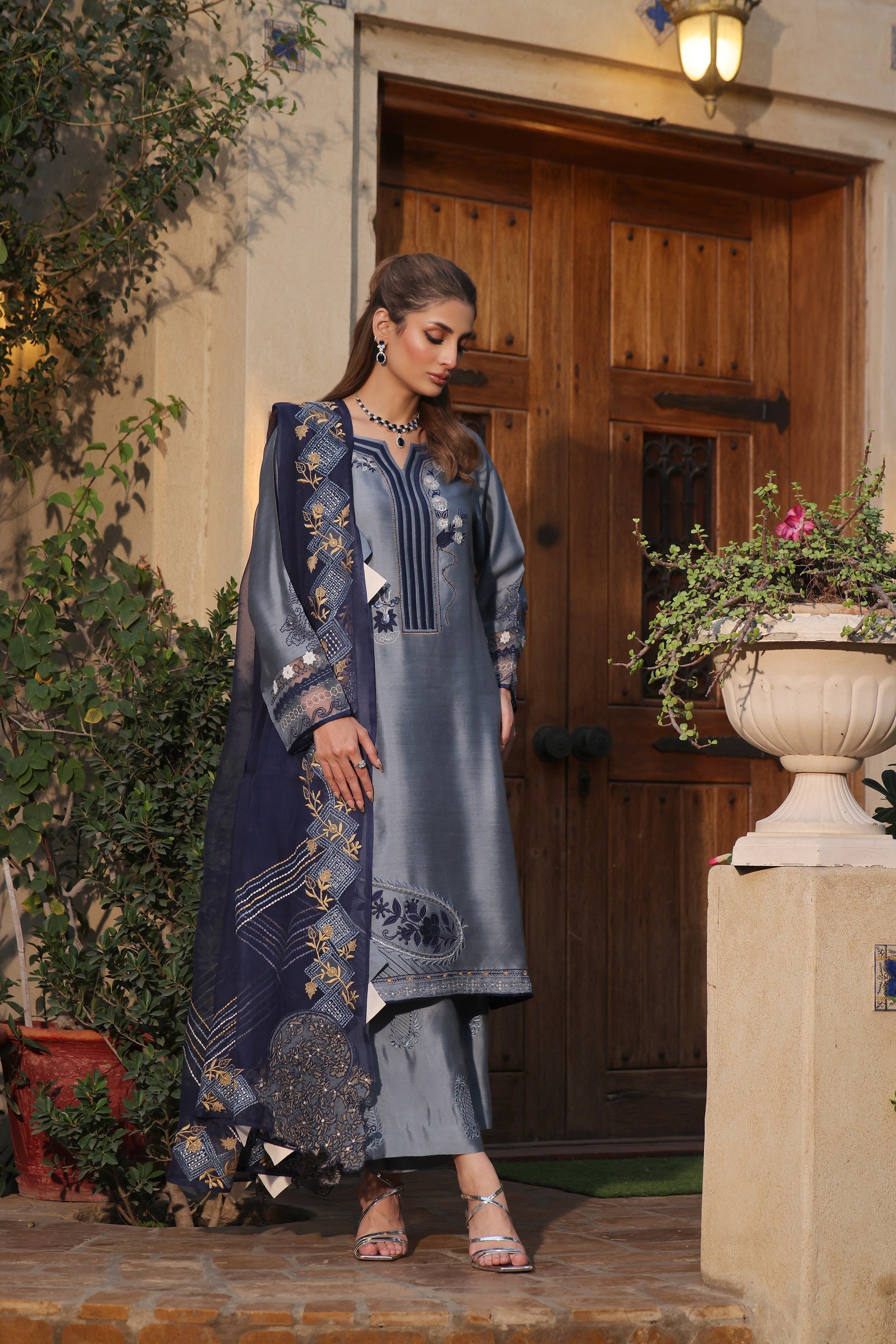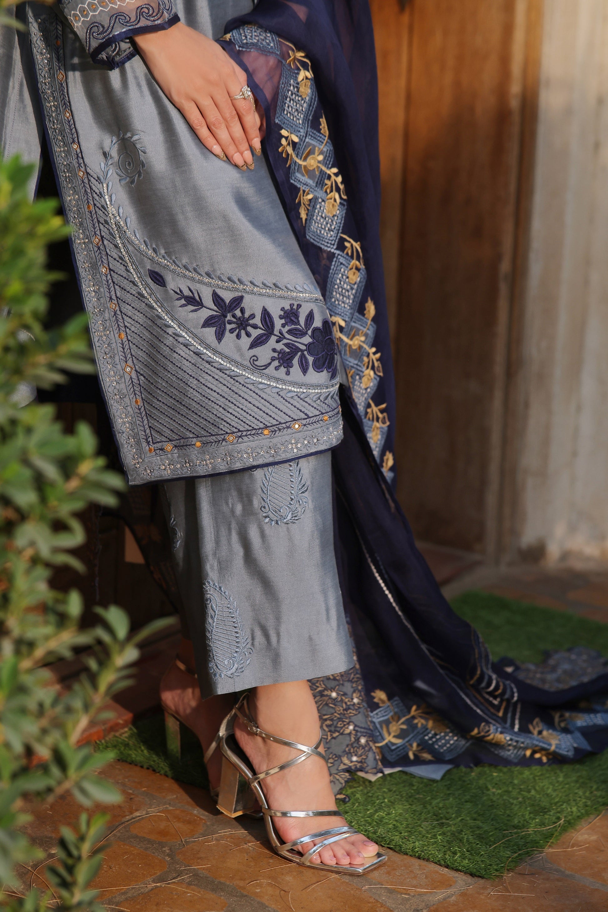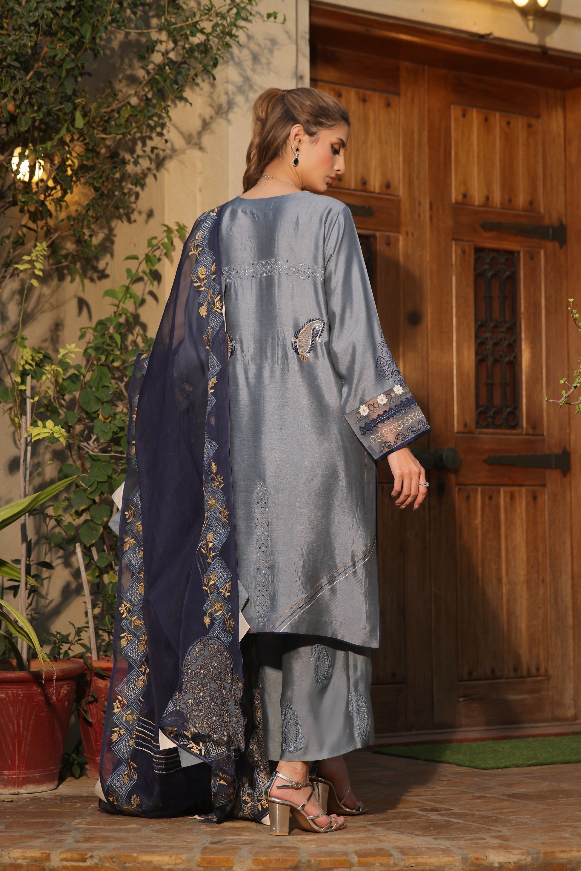 Expertly crafted, Tajdaar is a masterpiece. Made of gray sheesha silk, the shirt and polazo feature intricate applique and embroidery on the neckline and daman. With paisley embroidered motives and organza borders on the sleeves, this outfit exudes elegance. Its pure organza dupatta is adorned with 4-sided embroidered borders and palu.