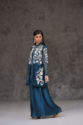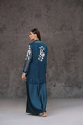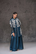 Introducing Zayra, a pure organza teal jacket featuring exquisite Aari work on both panels. The front open hemline and sleeves, as well as the back adorned with pearls, kora, dapka, and stones, make it a true showstopper. Comes with a Chamois camisole or long slip, and pleated chamois for added elegance. Elevate your look with Zayra.
