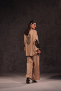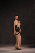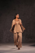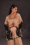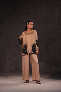 Expertly crafted from luxurious silk, the Zevira ensemble exudes elegance and sophistication. The three-piece set includes a chic nude jacket with black applique and meticulously hand-embellished swarovski crystals. Paired with an inner shirt and straight pants, this ensemble offers a timeless and sophisticated look for any occasion. Elevate your wardrobe with Zevira.