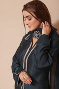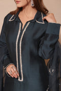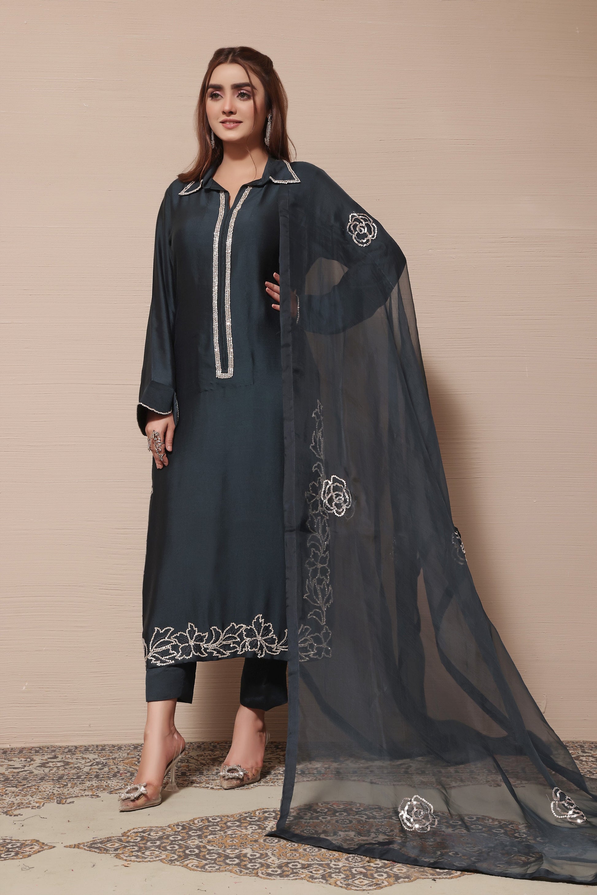 This Teal outfit comprises of delicately curated on sheesha silk & organza dupptta with fine embellishment & embroidery details on them to celebrate the festive season with class.