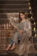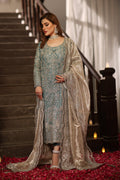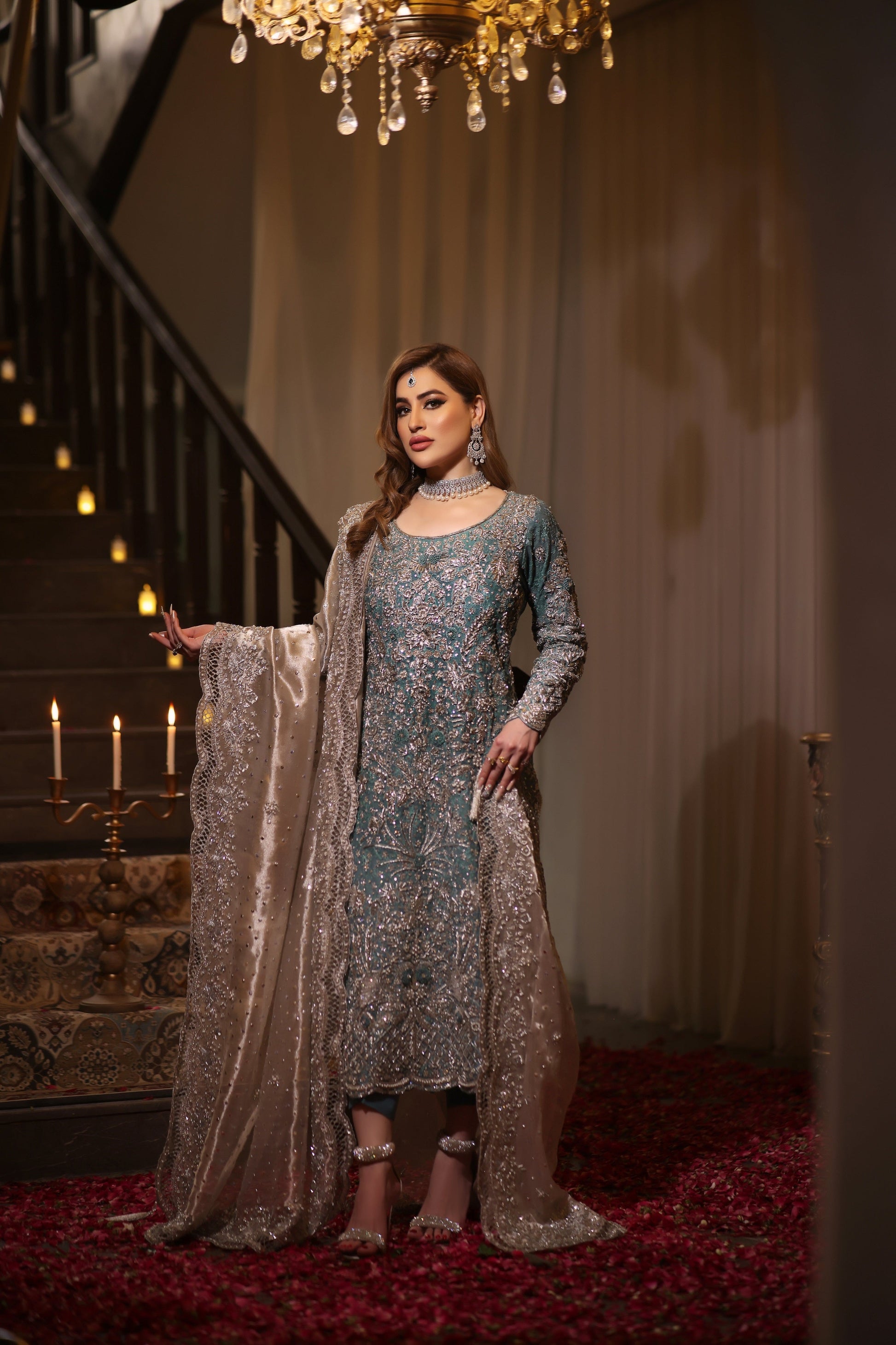 Noor comprises of number of opulent outfits, one of which is this beautiful ensemble curated on chicken net with silver zardozi heavy work on the shirt with intricate details.