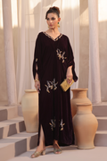 Deep purple french velvet kaftan with intricate neckline adorn with diamonties and handwork motives all ovar .